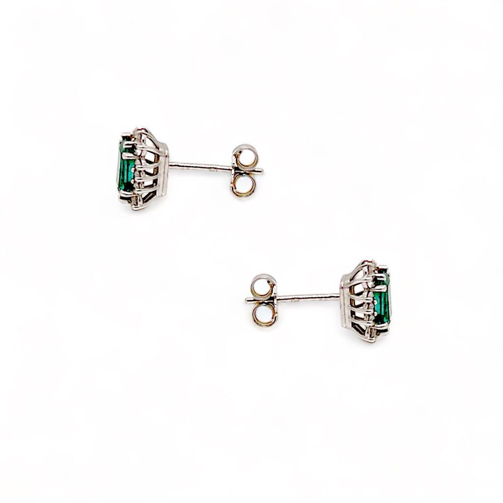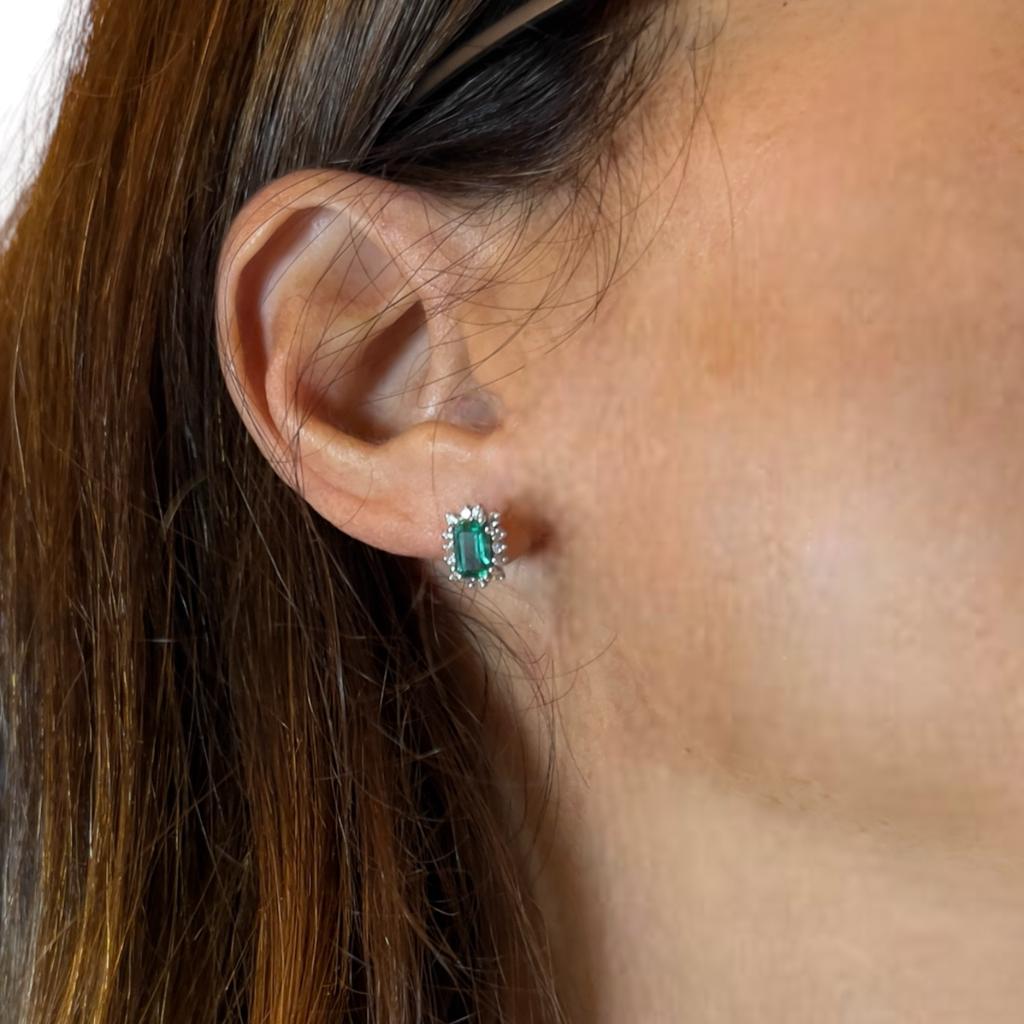 I diamanti, con una caratura di 0,30 ct, purezza VS1 e colore F, brillano con una luce intensa, grazie al taglio brillante che esalta ogni sfaccettatura. Il loro scintillio è delicatamente contrastato dalla profondità verde degli smeraldi, che con una caratura di 1,20 ct e un taglio smeraldo, evocano un’aura di mistero e fascino. La simmetria tra le gemme crea una danza visiva che cattura lo sguardo e invita ad un’ulteriore esplorazione.