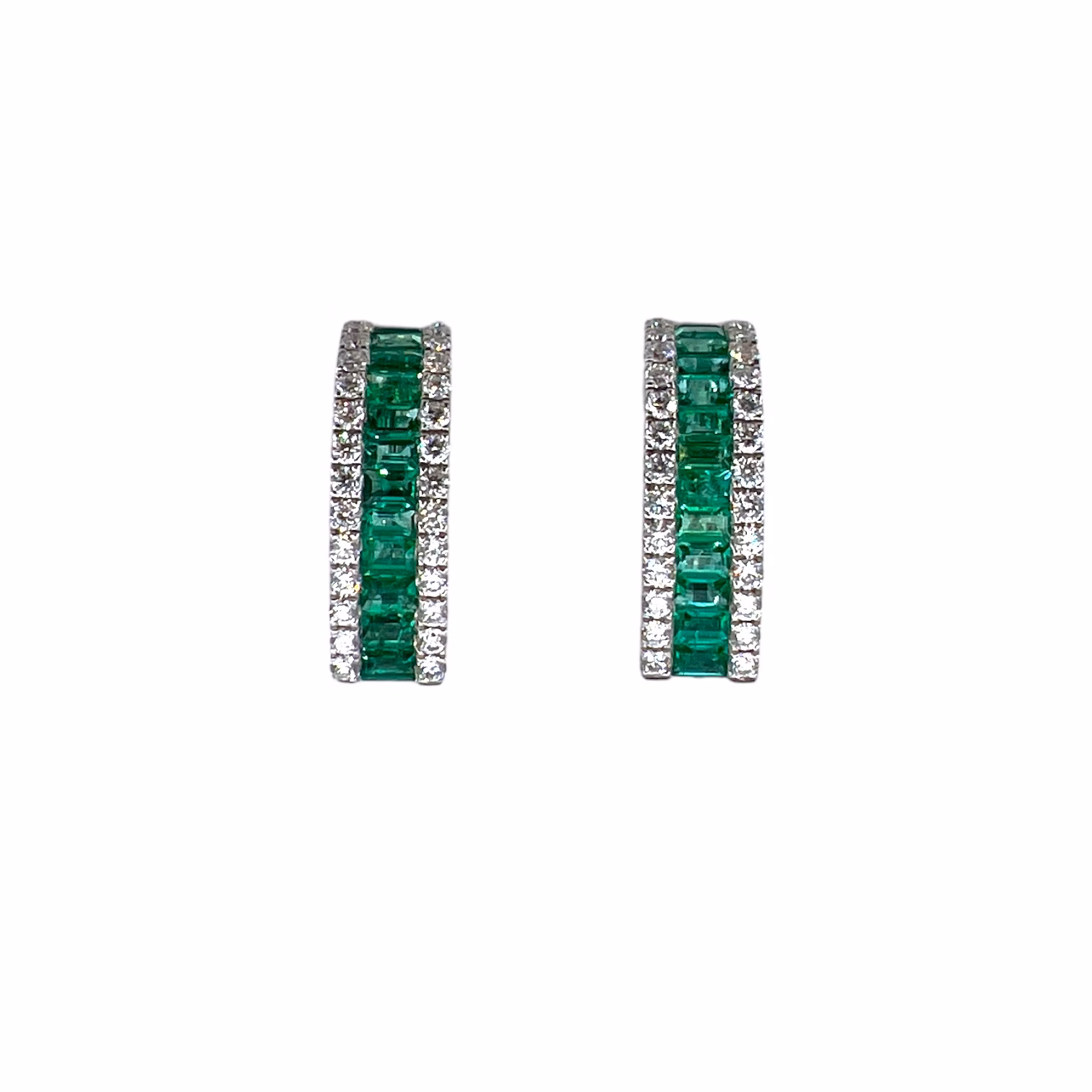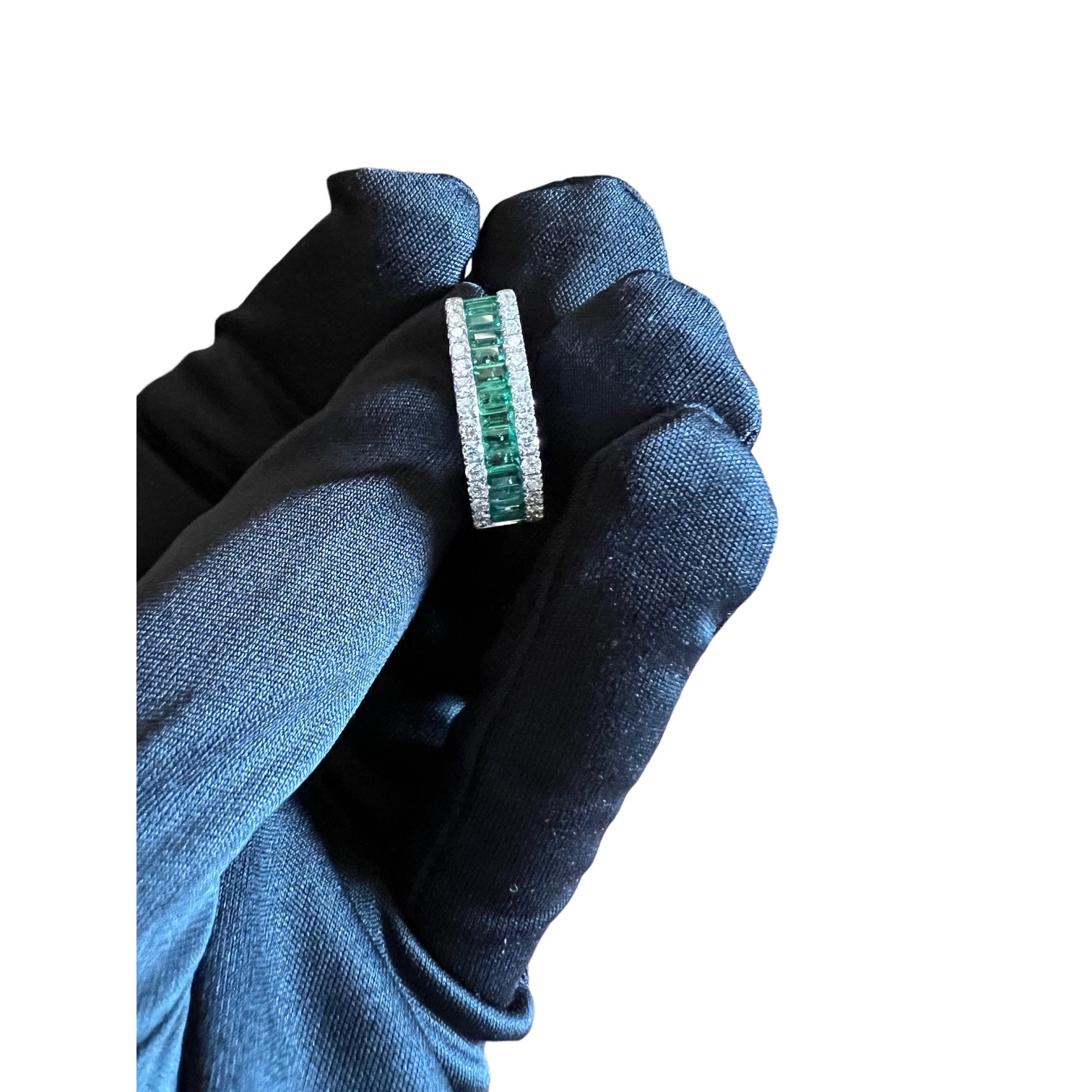 La montatura in oro bianco 750% 18kt è la cornice perfetta per accogliere gli smeraldi naturali e i diamanti, gemme che si distinguono per la loro bellezza e purezza. Gli smeraldi, con una caratura totale di 1,52 ct, sono stati scolpiti in un elegante taglio baguette, un taglio che esalta la loro colorazione verde intenso e la loro chiarezza. Questa forma geometrica si contrappone magnificamente al taglio brillante dei diamanti, creando un gioco di luci e forme che è al contempo sofisticato ed emozionante.