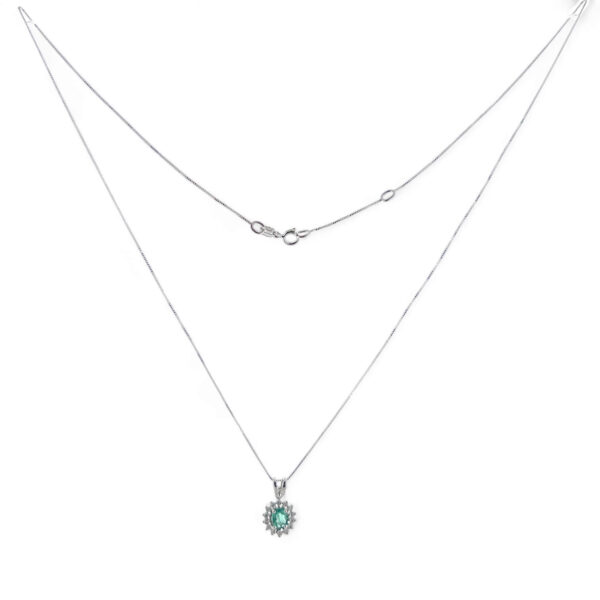 La montatura in oro bianco 750% incornicia con eleganza una splendida combinazione di gemme preziose: uno smeraldo taglio ovale, con un peso di 0,30 carati, e diamanti taglio brillante, con un peso totale di 0,12 carati. L’smeraldo, con il suo verde intenso e la sua lucentezza senza pari, è un simbolo di lusso e raffinatezza, mentre i diamanti aggiungono un tocco di brillantezza e scintillio.