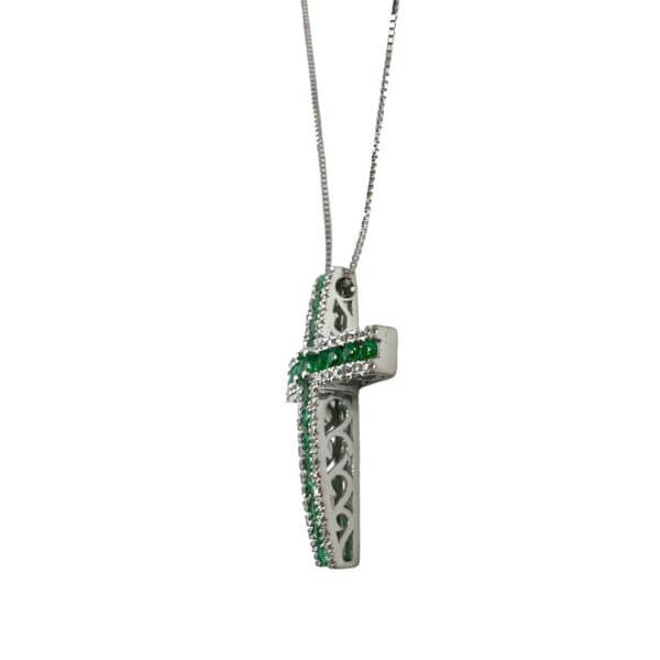 Pendente croce oro bianco 750% 18kt CIPOLLA DAL 1950 GIOIELLIERI COLLEZIONE BELLE EPOQUE , lavorazione artigianale, catenina veneziana in oro bianco 18kt,diamanti 0,18 ct colore F/vs1 smeraldi 0,51ct