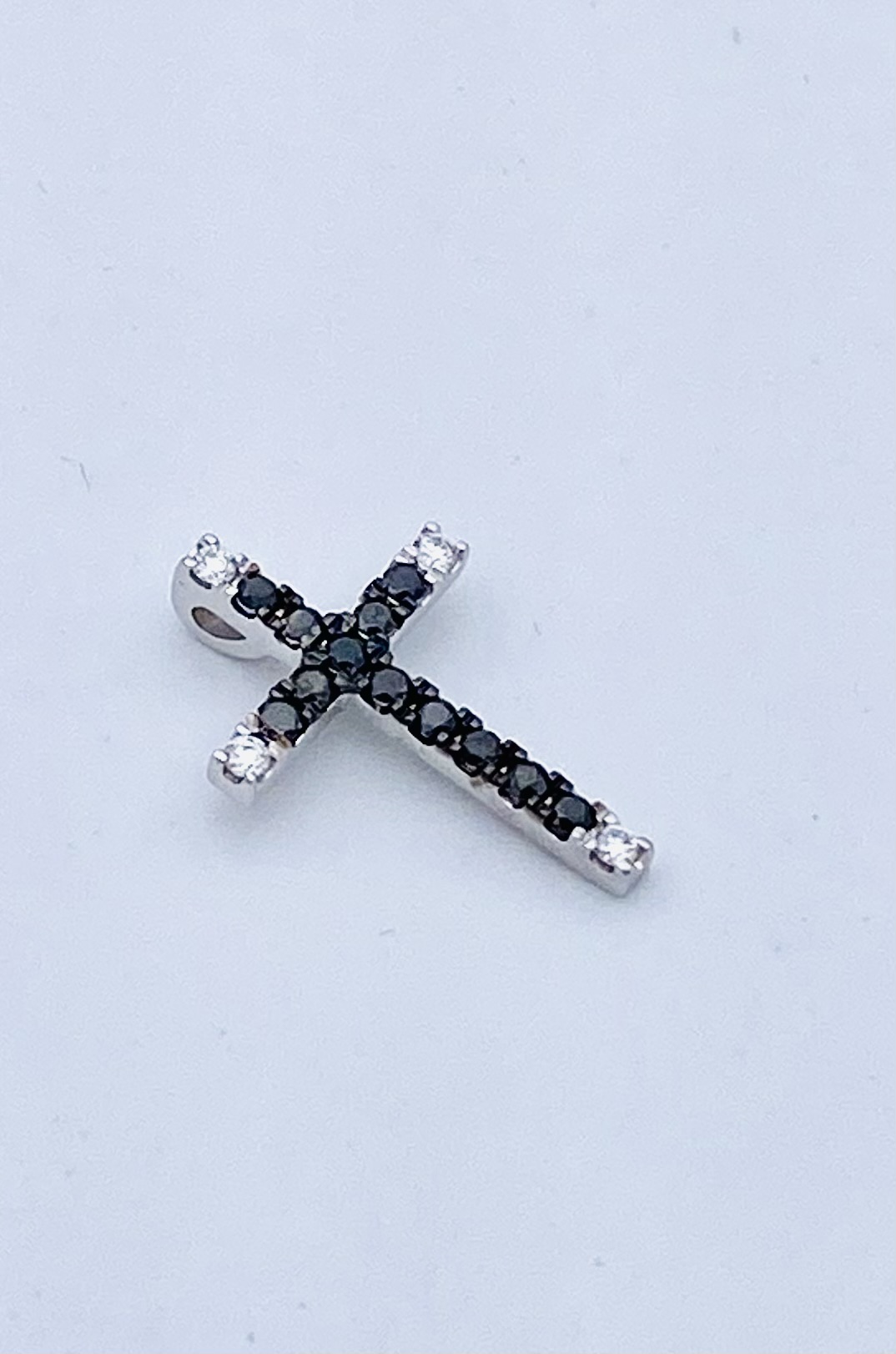 Pendente croce con diamanti in oro bianco 750% 18 kt, Diamanti 0,05 Ct colore F purezza VS1, Diamanti neri 0,10 ct