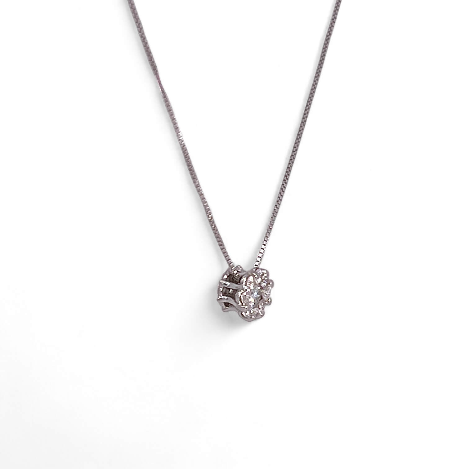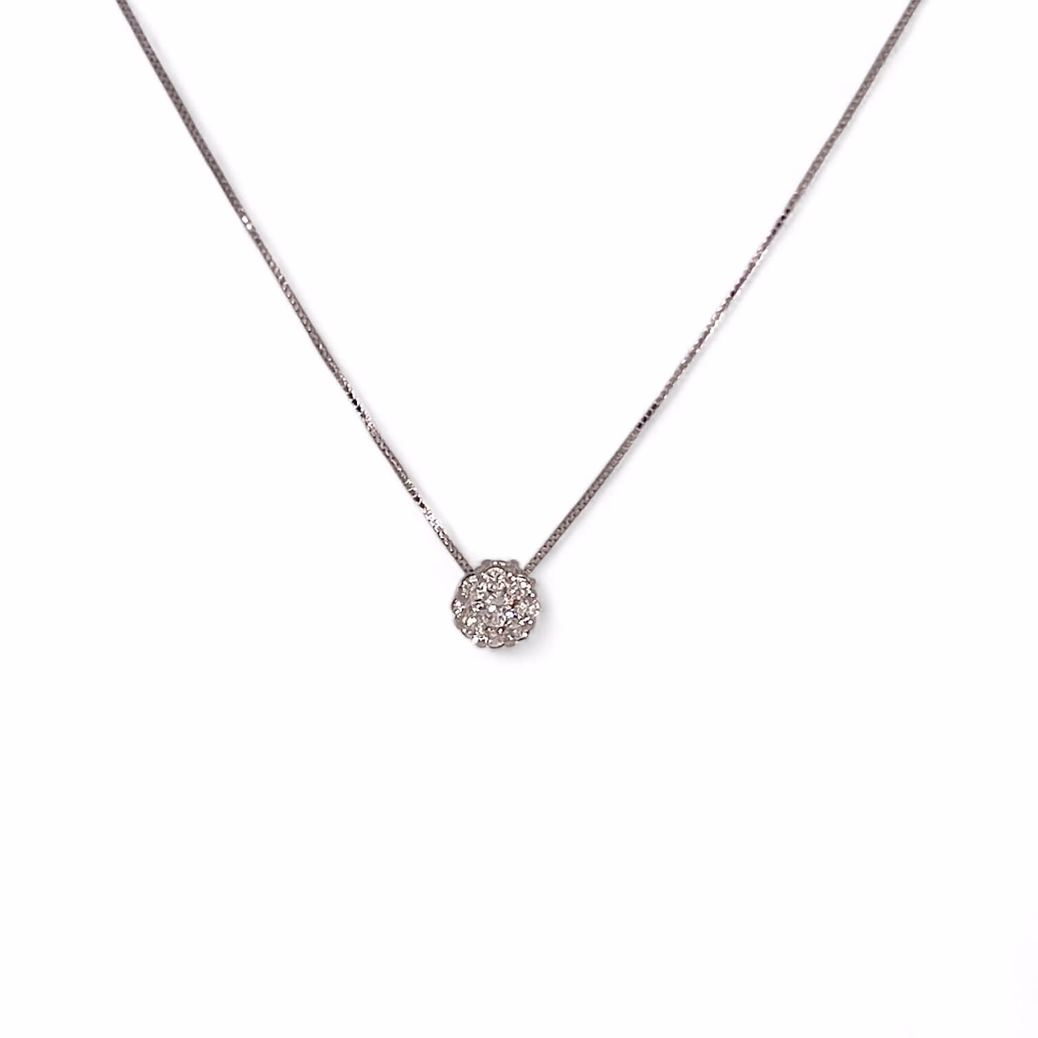 Il girocollo con pendente punto luce di diamanti della collezione NARCISO di Cipolla dal 1950 Gioiellieri è un capolavoro di raffinatezza e maestria artigianale. Realizzato in oro bianco 750‰, questo gioiello cattura la luce con la sua montatura e i suoi diamanti taglio round brillante, di colore F e purezza VS1, con diamanti contorno 0,08 ct, La delicatezza del pavè di diamanti aggiunge un tocco di luminosità, rendendo il pendente un accessorio ideale per ogni occasione.