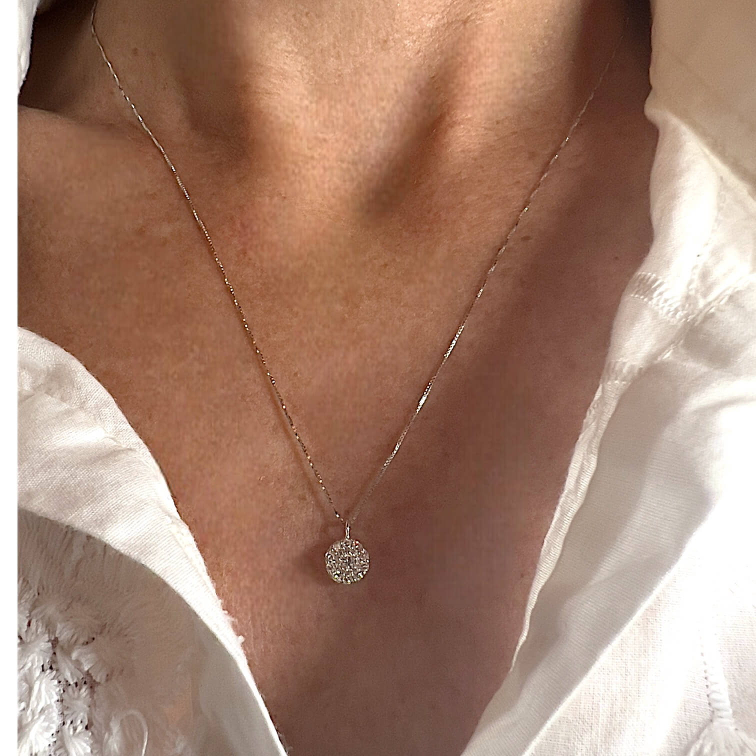 Il Girocollo è impreziosito da un diamante centrale di caratura 0,30 taglio brillante e contorno di 0,08 ct tutti di colore F e purezza VS1. Queste gemme di alta qualità, selezionate con cura, garantiscono una luminosità straordinaria e una chiarezza impeccabile. Il design sobrio e raffinato del pendente lo rende un gioiello versatile, perfetto per essere indossato in ogni occasione, dal giorno alla sera.