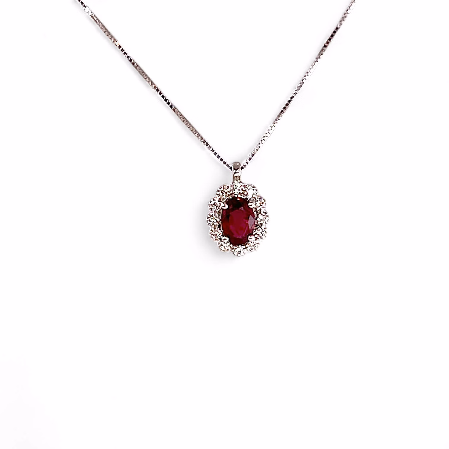 Girocollo con rubino e diamanti lavorazione artigianale Cipolla dal 1950 Gioielli COLLEZIONE BELLE EPOQUE,montatura in oro bianco 750% 18 kt diamanti 0,13 ct colore F purezza VS1 Rubino naturale provenienza India 0,60 ct taglio ovale