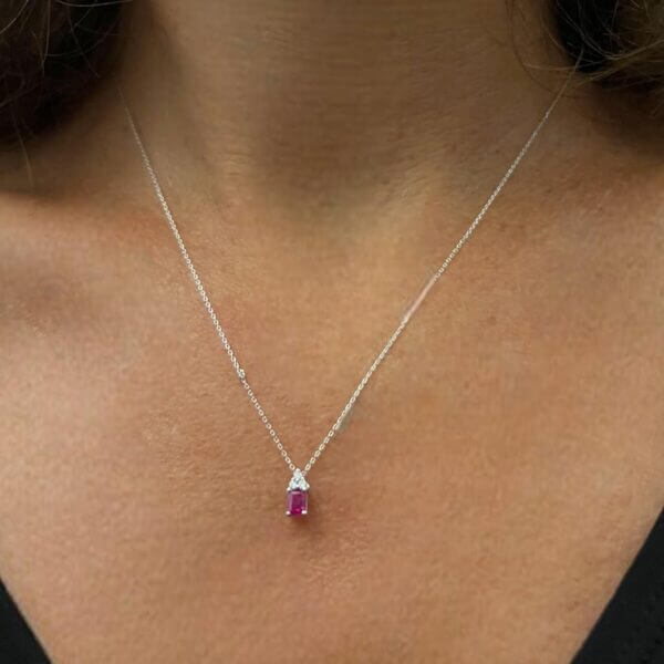 Girocollo con rubino e diamanti Cipolla dal 1950 Gioielli COLLEZIONE GEMME, lavorazione artigianale; Montatura e catenina maglia veneziana in oro bianco 750% Diamanti Taglio brillante peso 0,03 Ct colore F purezza VS1, Rubino taglio smeraldo peso 0,22 ct