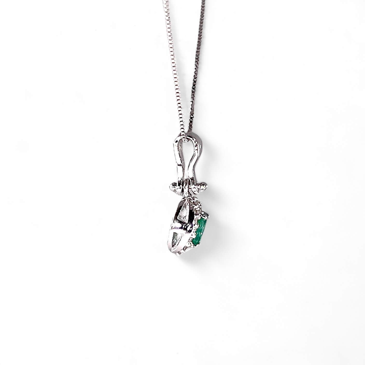 La montatura in oro bianco 750% offre un’elegante cornice per la preziosa pietra centrale: uno smeraldo taglio ovale, con un peso di 0,14 carati. La sua radiosa bellezza è accentuata dai dettagli scintillanti dei diamanti taglio brillante, che adornano il pendente con una luminosità senza pari. Con un peso totale di 0,07 carati, i diamanti presentano una purezza di classe SI1 e un colore incantevole, classificato come F.