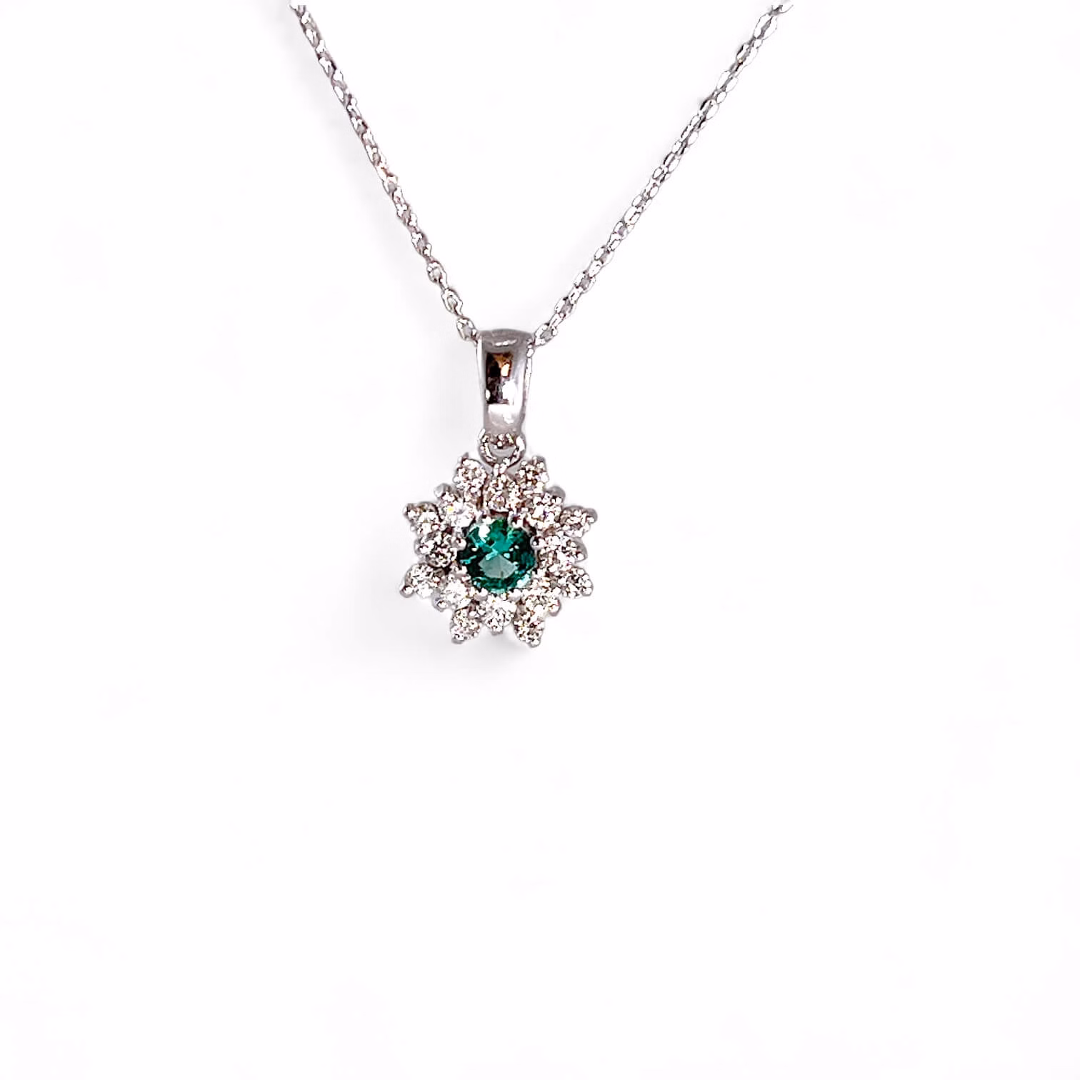 La pietra principale, uno splendido smeraldo taglio rotondo con un peso di 0,18 carati, risplende con una bellezza senza tempo, catturando lo sguardo con la sua lucentezza verde e la sua purezza cristallina. Circondato da diamanti taglio brillante, con un peso totale di 0,10 carati, questo pendente emana una luce radiosa e un’eleganza senza pari.