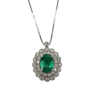 Girocollo smeraldo e diamanti COLLEZIONE BELLE EPOQUE Cipolla dal 1950 Gioielli, lavorazione artigianale; montatura in oro bianco 750% Diamanti taglio brillante 0,45 Ct colore F purezza VS1, Smeraldo taglio ovale peso 1,32 ct.