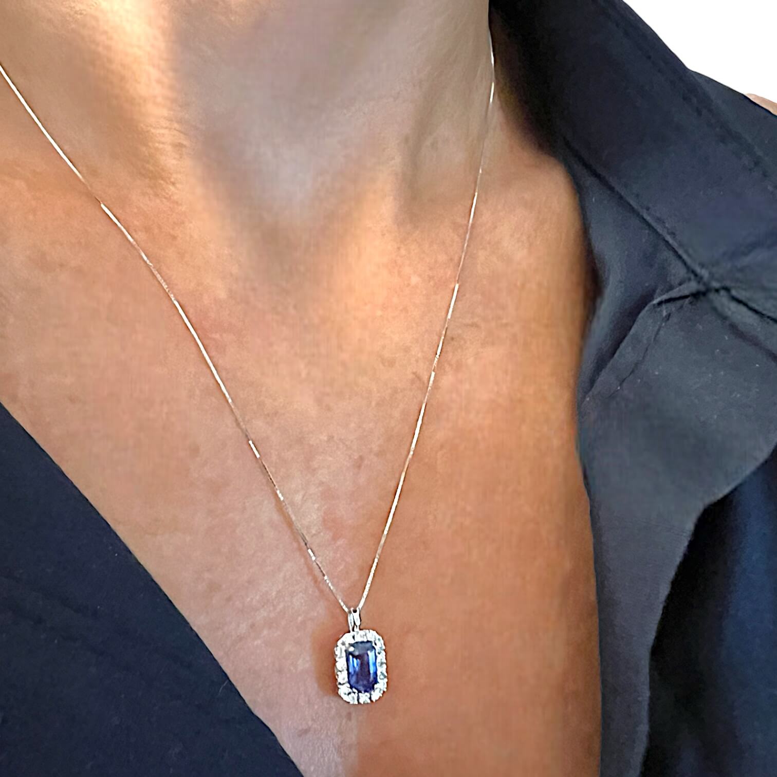 Il zaffiro naturale, con un peso di 0,74 carati e taglio smeraldo, aggiunge una nota di colore e profondità al pendente, conferendo un’aura di mistero e fascino. La sua bellezza sofisticata si sposa perfettamente con la luminosità dei diamanti, creando un contrasto sublime che incanta gli occhi e cattura l’immaginazione.