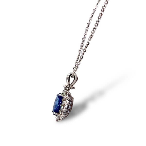 Girocollo con zaffiro e diamanti Cipolla dal 1950 Gioielli lavorazione artigianale; Montatura in oro bianco 750% 18 kt, Diamanti taglio brillante peso 0,23 Ct colore F purezza VS1 Zaffiro taglio ovale peso 1,30 ct