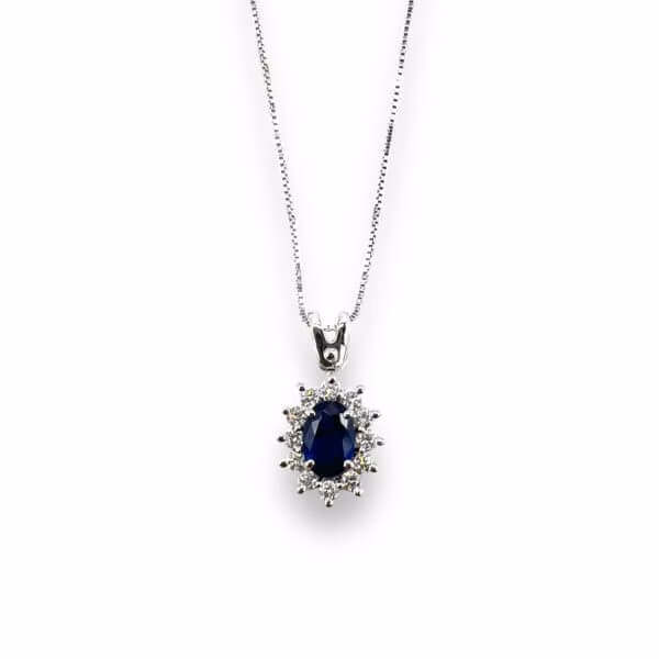 Girocollo con zaffiro e diamanti Cipolla dal 1950 Gioielli COLLEZIONE BON TON, lavorazione artigianale; Montatura in oro bianco 750% 18 kt, Diamanti taglio brillante peso 0,14 Ct colore F purezza vs2, Zaffiro taglio ovale peso 0,55 ct catenina maglia veneziana in oro bianco 750%.
